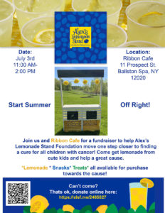 Joining the Ribbon Café on Prospect Street in hosting the event that will additionally include snack bar foods, music and more will be several local families who care deeply about Alex’s Lemonade Stand Foundation, a national not-for-profit that emerged from the front yard lemonade stand of cancer patient Alexandra “Alex” Scott (1996-2004).